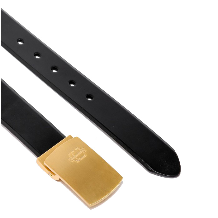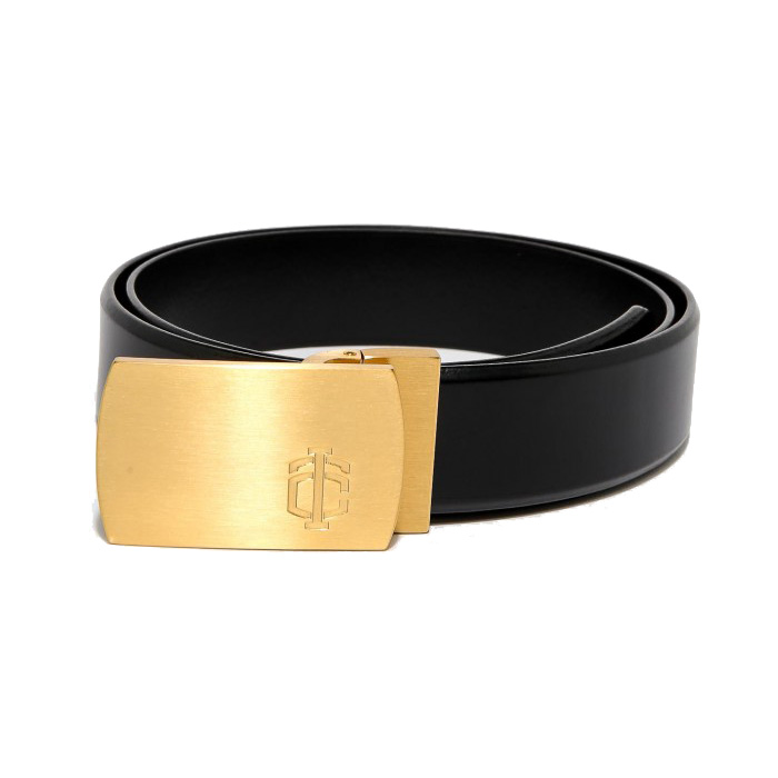 Solid rectangular belt buckle in a gold brush metallic finish engineered with solid hardware with The Imperialist Club Logo engraved.