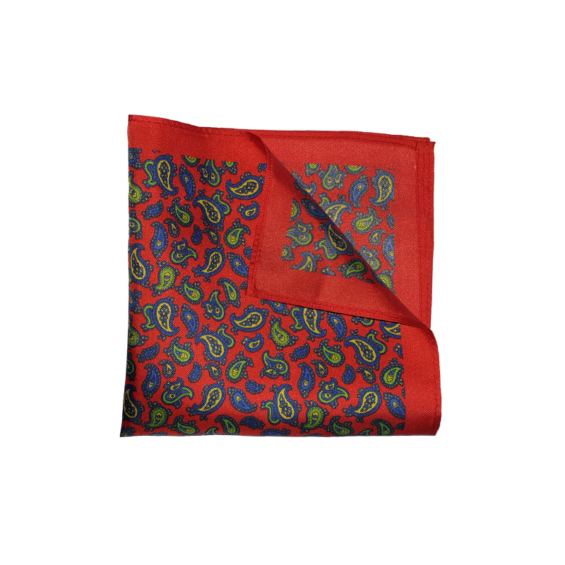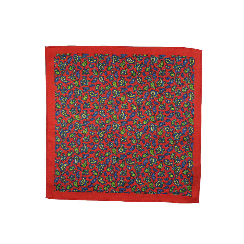 Add a new look to your ensemble to round off your unique style. This paisley silk pocket square is adorned with a vibrant color red and with a lush green paisley that’s sure to liven up any mood.